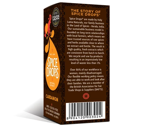 Spice Drops have been created by a family business founded on long term relationships with local farmers in the Land of Spices – Kerala, India – so they have trusted sources of raw spices and herbs close to where they extract and bottle. The result is high quality, fresh extracts which are consistent from batch to batch. Over 80% of their workforce is women, many from disadvantaged backgrounds. They recycle and use by-products resulting in an impressively low level of waste: less than 1%. They are a Guild of Fine Food Producer Member, and a member of the British Association for Fair Trade Shops & Suppliers (BAFTS).