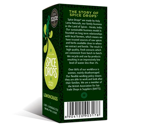Spice Drops have been created by a family business founded on long term relationships with local farmers in the Land of Spices – Kerala, India – so they have trusted sources of raw spices and herbs close to where they extract and bottle. The result is high quality, fresh extracts which are consistent from batch to batch. Over 80% of their workforce is women, many from disadvantaged backgrounds. They recycle and use by-products resulting in an impressively low level of waste: less than 1%. They are a Guild of Fine Food Producer Member, and a member of the British Association for Fair Trade Shops & Suppliers (BAFTS).