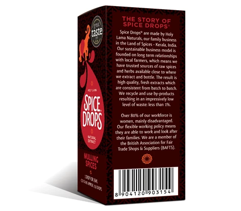 Spice Drops have been created by a family business founded on long term relationships with local farmers in the Land of Spices – Kerala, India – so they have trusted sources of raw spices and herbs close to where they extract and bottle. The result is high quality, fresh extracts which are consistent from batch to batch. Over 80% of their workforce is women, many from disadvantaged backgrounds. They recycle and use by-products resulting in an impressively low level of waste: less than 1%. They are a Guild of Fine Food Producer Member, and a member of the British Association for Fair Trade Shops & Suppliers (BAFTS).
