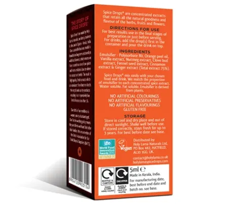 Spice Drops are concentrated extracts that retain all the natural goodness and authentic flavour of the herbs, fruits and flowers. Water and fat soluble, they mix easily with your chosen food or drink. Their emulsifier is derived from plants.