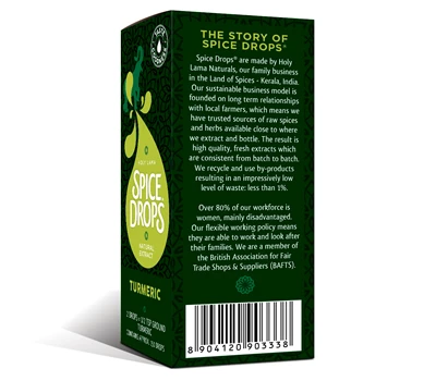 Spice Drops have been created by a family business founded on long term relationships with local farmers in the Land of Spices – Kerala, India – so they have trusted sources of raw spices and herbs close to where they extract and bottle. The result is high quality, fresh extracts which are consistent from batch to batch. Over 80% of their workforce is women, many from disadvantaged backgrounds. They recycle and use by-products resulting in an impressively low level of waste: less than 1%. They are a Guild of Fine Food Producer Member, and a member of the British Association for Fair Trade Shops & Suppliers (BAFTS).